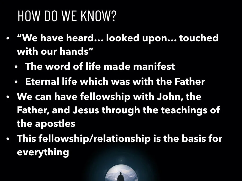 Notice how he begins the letter. He talks about the word of life as though it is a person. This sounds a lot like the gospel John also wrote, "The word became flesh and dwelt among us." Jesus is the word of God made manifest. He is the complete revelation of who God the Father is. John says that he is an eyewitness of this. He has proclaimed this to his readers so that they can be in fellowship with one another, with God the Father, and with his Son. This is a fantastic statement. The revelation of God through Jesus has made it to where we can have fellowship with God. To have the assurance of eternal life, we must have fellowship with God. This is where we get the idea that salvation is about a relationship, not rule-keeping.