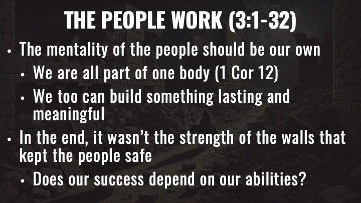 We started by picturing a city in ruins—people numb, hope lost. That’s what Nehemiah found in Jerusalem, but instead of being overwhelmed, he saw potential for restoration. Not by his power, but by what God could do through those willing to rebuild.